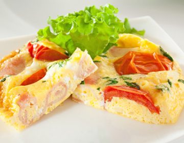 Накълцайте на ситно шалота и домата. Запечете леко в тавата от сета за печене или еднократна форма за печене заедно със зехтина за около 4 минути на 160 градуса. В отделна купа разбийте яйцата, добавете маслините и сметаната и ги сложете директно при запечения домат и шалот. Печете за още 10 минути на 160 градуса. Готовия омлет гарнирайте с наситнен магданоз и див лук