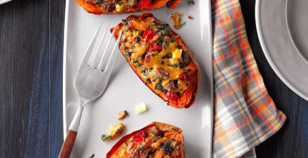 Необходими продукти : 2 средно големи сладки картофа1 с.л. олио/зехтин 1 ч.ч. спанак 1 ч.ч. сирене чедър2 ивици беконзелен лук1/4 ч.ч. червени боровинкисолчерен пиперНачин на приготвяне : ...